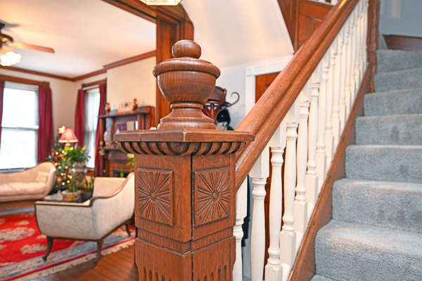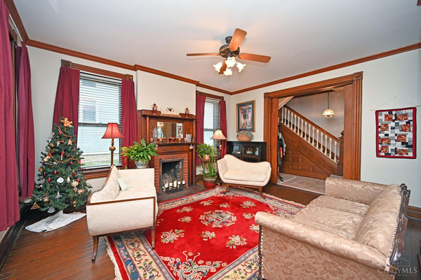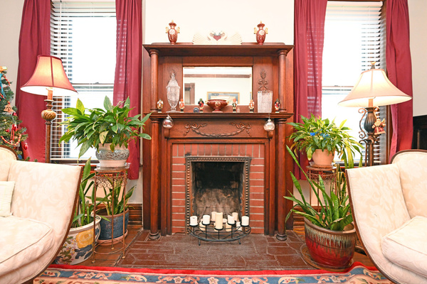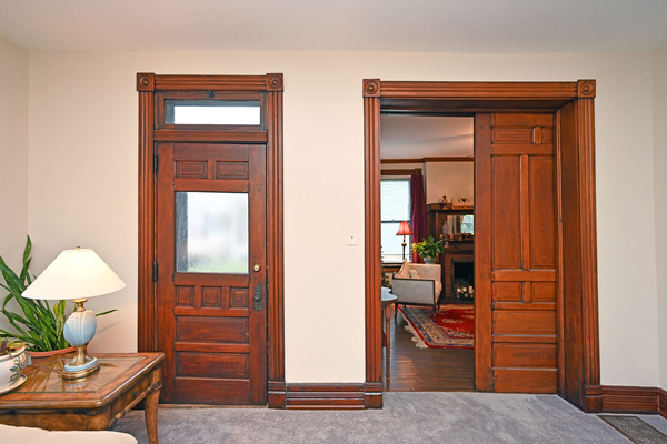 Pocket doors, large windows, transoms, hardwood floors, natural woodwork & fireplace decor.