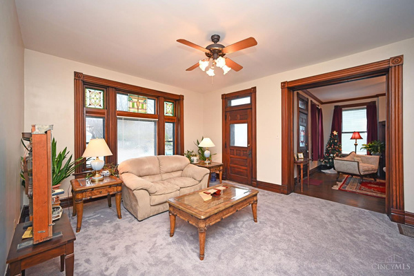 Pocket doors, extra entry, faces street, transoms, stained glass, soaring ceilings.